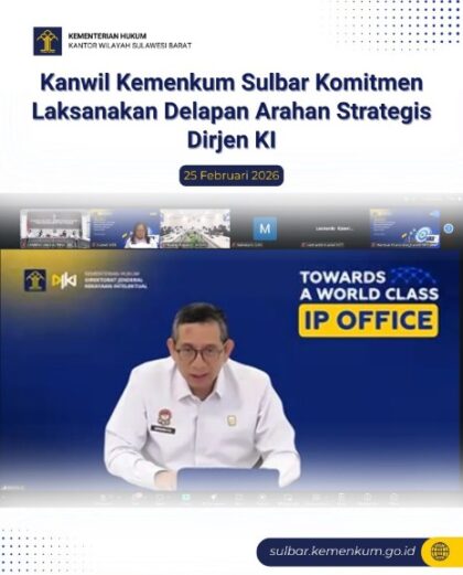 News | • Februari 25, 2026 • Kanwil Kemenkum Sulbar Komitmen Laksanakan Delapan Arahan Strategis Dirjen KI MAMUJU – Kepala Kantor Wilayah Kementerian Hukum Sulawesi Barat, Saefur Rochim, menegaskan komitmennya untuk mendukung...