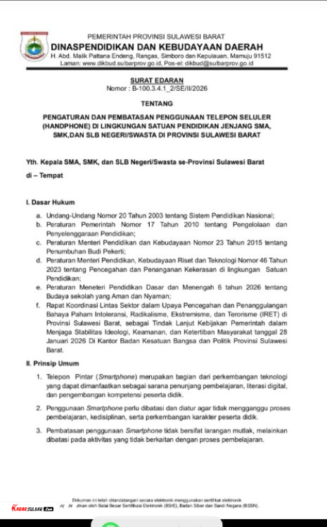 Surat edaran ini ditetapkan di Mamuju pada 12 Februari 2026 dan ditandatangani oleh Kepala Dinas Pendidikan dan Kebudayaan Provinsi Sulawesi Barat. (Rls)
