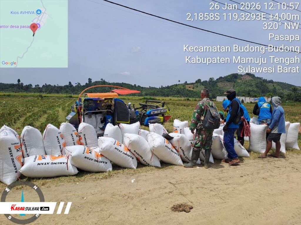 Mamuju Tengah – Babinsa Kodim 1418/Mamuju terus menunjukkan komitmennya dalam pembinaan wilayah melalui pendampingan sektor pertanian. Kali ini, Babinsa memimpin langsung kegiatan panen padi seluas kurang lebih 8 hektare bersama Kelompok Tani Usaha Baru di Desa Pasapa, Kecamatan Budong-Budong, Kabupaten Mamuju Tengah. Senin (26/1/2026).