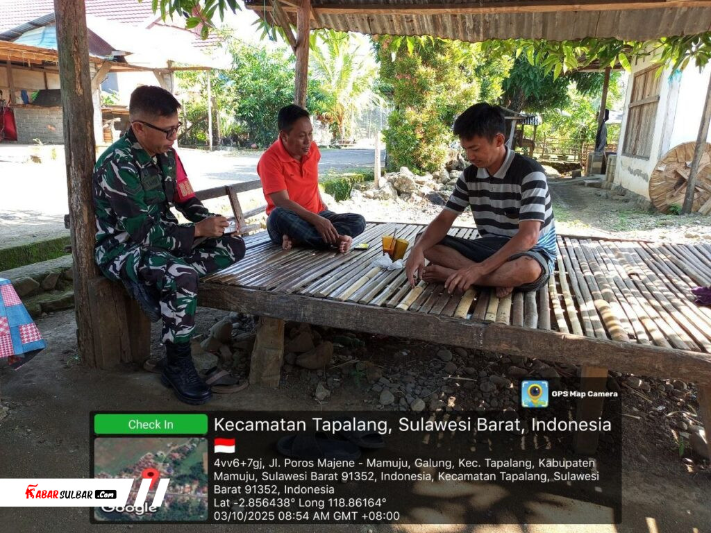 Mamuju, – Babinsa Koramil 1418-02/Tapalang, Serda Andi Tahir, melaksanakan kegiatan Pengumpulan Data Teritorial (Puldata) di wilayah Kecamatan Tapalang Barat, Kabupaten Mamuju, Jumat (3/10/2025).