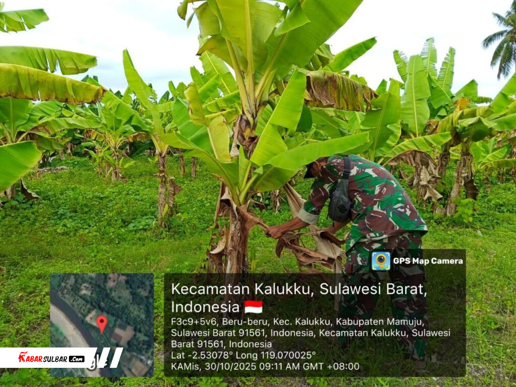 Mamuju — Dalam upaya mendukung program ketahanan pangan nasional, personel Koramil 1418-03/Kalukku kembali melaksanakan kegiatan perawatan tanaman pisang Cavendish, pemeliharaan sapi ternak, serta perawatan tanaman pepaya California di lahan Korem yang dikelola oleh Kodim 1418/Mamuju, bertempat di Dusun Taraweh, Desa Beru-beru, Kecamatan Kalukku, Kabupaten Mamuju, Kamis (30/10/2025).