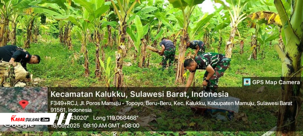 Mamuju, – Babinsa Koramil 1418-03/Kalukku melaksanakan kegiatan perawatan tanaman pisang cavendis dan pepaya di lahan Korem yang dikelola oleh Kodim 1418/Mamuju, berlokasi di Dusun Taraweh, Desa Beru-beru, Kecamatan Kalukku, Kabupaten Mamuju. Selasa (16/09/2025).