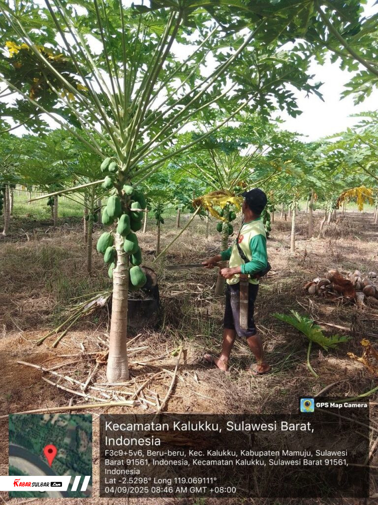 Mamuju – Dalam rangka mendukung program ketahanan pangan, Babinsa Koramil 1418-03/Kalukku melaksanakan perawatan tanaman pisang cavendis dan pepaya yang berada di lahan ketahanan pangan milik Korem 142/Tatag yg di Kelola oleh Kodim 1418/Mamuju, tepatnya di Dusun Taraweh, Desa Beru-beru, Kecamatan Kalukku, Kabupaten Mamuju. Kamis (4/9/2025).