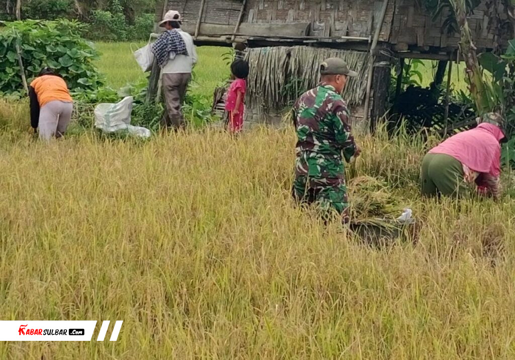 Mamasa, – Babinsa koramil 1428-02/Sumarorong Serma Agus membantu warga turun ke sawah dalam rangka panen padi lokal untuk menunjang ketahanan pangan di Kelurahan Sumarorong Kecamatan Sumarorong Kabupaten Mamasa, Minggu (12/10/2025)