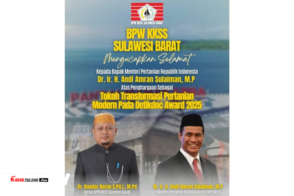 MAMUJU — Badan Pengurus Wilayah Kerukunan Keluarga Sulawesi Selatan (BPW KKSS) Sulawesi Barat resmi menyampaikan ucapan selamat kepada Menteri Pertanian Republik Indonesia, Dr. Ir. H. Andi Amran Sulaiman, M.P, atas diraihnya penghargaan bergengsi sebagai Tokoh Transformasi Pertanian Modern pada ajang Detikdoc Award 2025. Ucapan tersebut ditampilkan melalui sebuah poster resmi yang beredar luas dan mendapat respons positif dari berbagai kalangan.