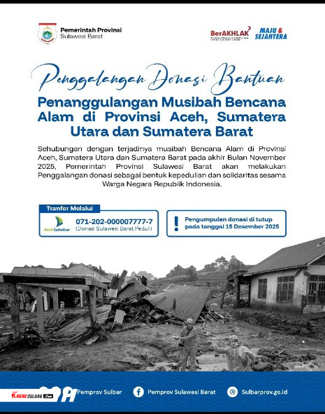 News | • Desember 4, 2025 • Pemprov Sulbar Penggalangan Dana untuk Bencana Alam Dilanda Provinsi Aceh, Sumatera Utara, dan Sumatera Mamuju – Pemerintah Provinsi Sulawesi Barat resmi mengumumkan penggalangan donasi untuk membantu penanggulangan musibah bencana...