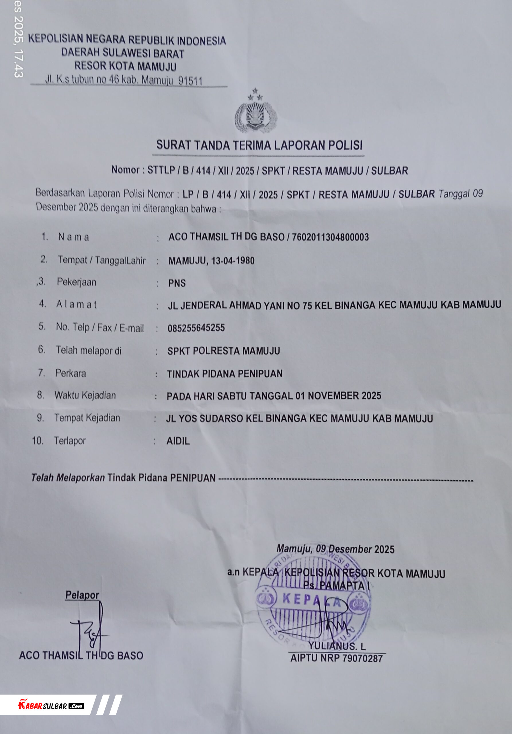 Kasi Humas Polresta Mamuju, Ipda Herman Basir, membenarkan bahwa laporan dengan nomor STTLP/B/414/XII/2025 telah diterima dan sedang ditindaklanjuti.