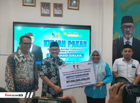 POLMAN – Gubernur Provinsi Sulawesi Barat, Suhardi Duka (SDK), menyerahkan bantuan dana hibah sebesar Rp100 juta kepada Institut Hasan Sulur (IHS), Jumat (24/10/2025).