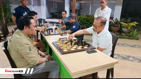 MAMUJU — Gubernur Sulawesi Barat, Suhardi Duka, bersama Ketua Pengurus Provinsi (Pengprov) Persatuan Catur Seluruh Indonesia (Percasi) Sulbar, H. Jayadi, melakukan pertandingan eksebisi catur di kediaman Gubernur di Jalan Husni Thamrin, Simpang Lima Mamuju, Senin (8/10/2025). Kegiatan tersebut menjadi bagian dari persiapan launching maskot Kejuaraan Nasional (Kejurnas) Catur 2025 yang akan digelar di Sulawesi Barat.