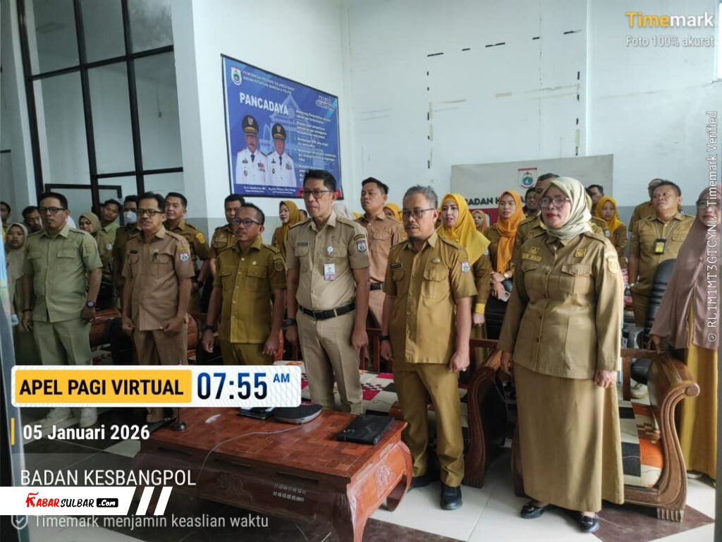 Mamuju — Kepala Badan Kesatuan Bangsa dan Politik (Kesbangpol) Provinsi Sulawesi Barat, Muh. Darwis Damir, bersama seluruh jajaran menghadiri Apel Virtual lingkup Pemerintah Provinsi Sulawesi Barat, Senin 5 Januari 2026. Apel dipimpin langsung Gubernur Sulbar dan diikuti Wakil Gubernur, Sekretaris Daerah, para Asisten, serta Staf Ahli lingkup Pemprov Sulbar.