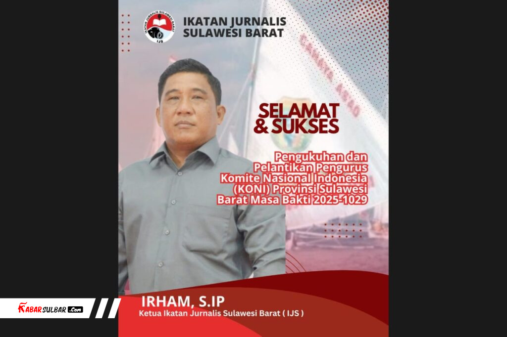 Mamuju — Ikatan Jurnalis Sulawesi Barat (IJS) menyampaikan ucapan selamat dan sukses atas pengukuhan serta pelantikan Pengurus Komite Nasional Indonesia (KONI) Provinsi Sulawesi Barat Masa Bakti 2025–2029. Dukungan tersebut disampaikan langsung oleh Ketua IJS Sulbar, Irham, S.IP, sebagaimana tergambar dalam poster resmi yang beredar pada Kamis (11/12/2025).