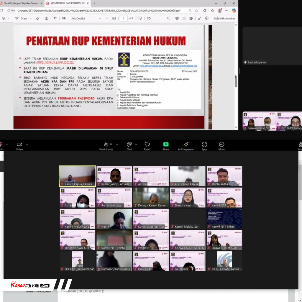 Mamuju – Kantor Wilayah Kementerian Hukum (Kemenkum) Sulawesi Barat turut serta dalam kegiatan Supervisi dan Evaluasi Penyusunan Rencana Umum Pengadaan (RUP) Kementerian Hukum yang diselenggarakan secara virtual pada Selasa, 4 Maret 2025.