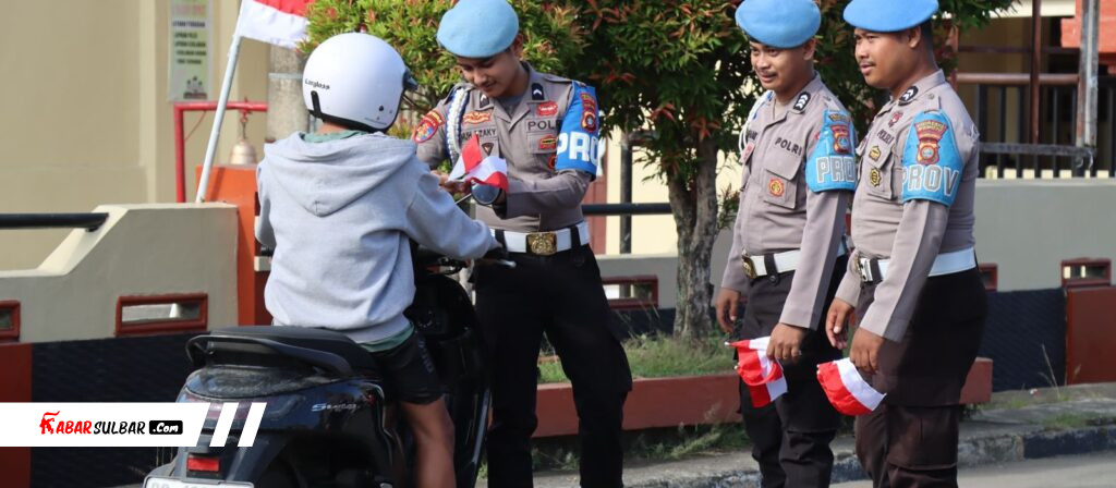 Mamuju – Menyambut Hari Ulang Tahun (HUT) Kemerdekaan Republik Indonesia ke-80, Polresta Mamuju kembali menggelar aksi pembagian bendera merah putih kepada pengguna jalan yang melintas di depan Markas Polresta Mamuju, Jalan KS. Tubun Mamuju, Jumat (8/08/2025).