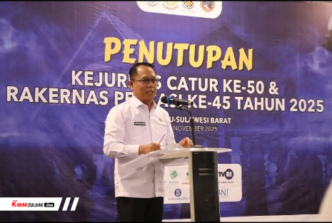 Mamuju – Sekprov Sulbar, Junda Maulana secara resmi menutup Kejuaraan Nasional (Kejurnas) Catur ke-50 dan Rapat Kerja Nasional (Rakernas) Percasi ke-45 tahun 2025 di Ballroom Hotel Maleo Town Square (Matos) Mamuju, Rabu 12 November 2025.