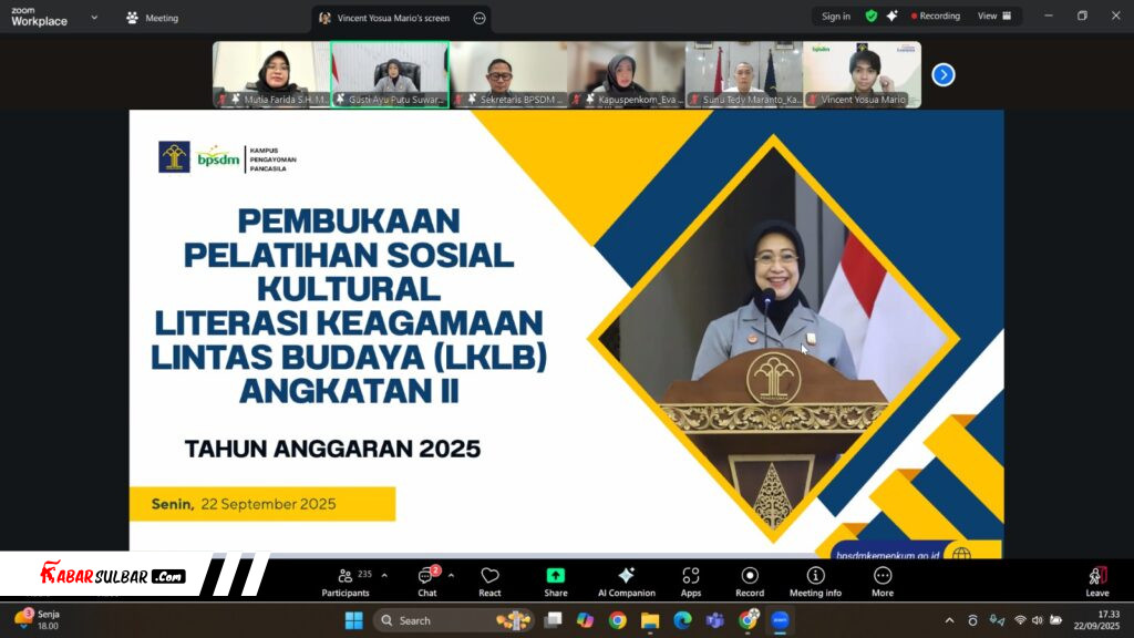 Mamuju, 22 September 2025 – Kakanwil Kemenkum Sulbar, Sunu Tedy Maranto dan Kadiv P3H John Batara Manikallo mengikuti Pelatihan Sosial Kultural Literasi Keagamaan Lintas Budaya (LKLB) Angk. II Tahun 2025 secara virtual.