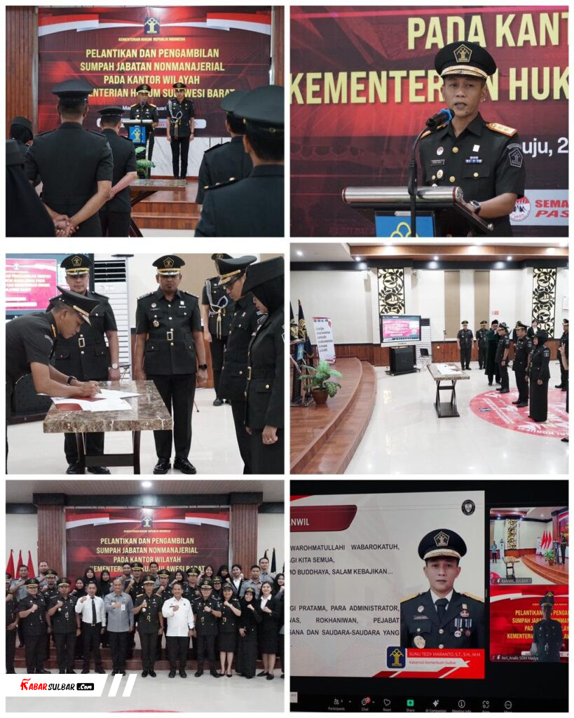 Kegiatan Pelantikan dan Pengambilan Sumpah Jabatan Non Manajerial pada Kantor Wilayah Kementerian Hukum Sulawesi Barat berlangsung di Aula Pengayoman Kantor Wilayah dihadiri oleh Pimpinan Tinggi Pratama, pejabat fungsional, pelaksana, dan tamu undangan.