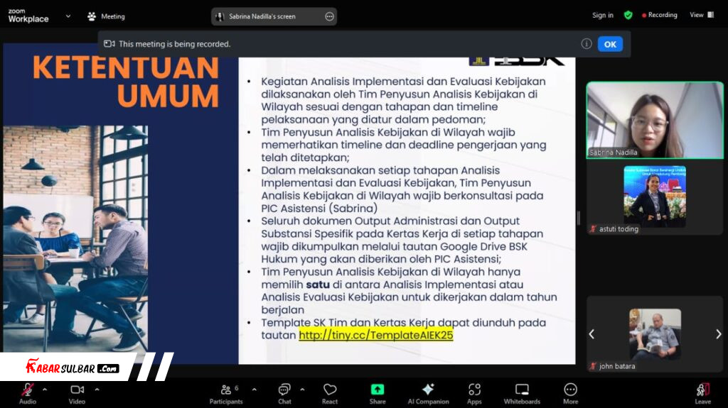 Kegiatan ini dihadiri oleh Kepala Divisi P3H, Ketua Tim Kelompok Kerja (Pokja) Program Strategi Kebijakan Hukum, Tim Analisis Implementasi Kebijakan Hukum Kantor Wilayah, serta Sabrina Nadia, Person in Charge (PIC) kegiatan Analisis Implementasi Evaluasi Kebijakan (AIEK) dari Badan Strategi Kebijakan (BSK) Kemenkum untuk wilayah Sulawesi Barat.