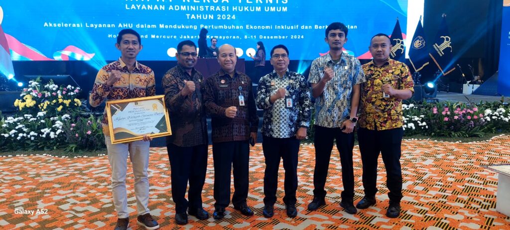 Diakhir Kegiatan Rapat Kerja Teknis Layanan AHU, Direktorat Jenderal Administrasi Hukum Umum memberikan penghargaan kepada Kantor Wilayah atas kinerja yang telah dilakukan selama Tahun 2024. Kantor Wilayah Kementerian Hukum Sulawesi Barat meraih penghargaan terbaik ketiga atas Kategori Peningkatan Kepatuhan Penghapusan Jaminan Fidusia yang telah habis Masa Perjanjiannya di Wilayah Tahun 2013-2016.