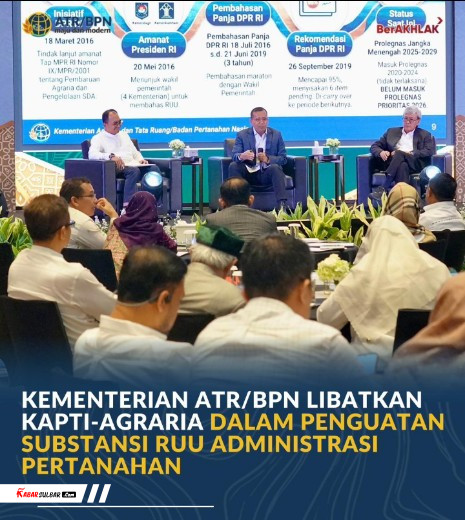 Jakarta, Kabarsulbar.com – Staf Ahli Bidang Teknologi Informasi, Dwi Budi Martono, menjadi narasumber dalam Dialog Strategis yang diusung oleh Keluarga Alumni Pendidikan Tinggi-AGRARIA (KAPTI-AGRARIA). Dalam acara yang berlangsung pada Jumat (06/03/2026), ia menyatakan bahwa Kementerian Agraria dan Tata Ruang/Badan Pertanahan Nasional (ATR/BPN) membuka ruang kolaborasi untuk memberikan masukan dalam proses penyusunan Rancangan Undang-Undang (RUU) Administrasi Pertanahan.