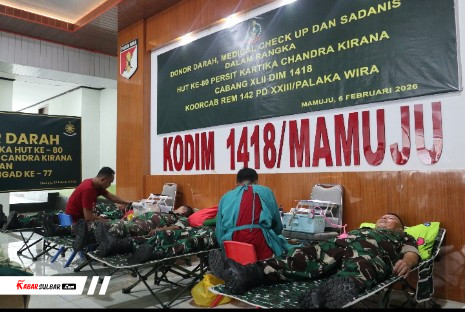 Mamuju – Kodim 1418/Mamuju melaksanakan kegiatan Donor Darah, Medical Check Up (MCU), dan pemeriksaan Sadanis dalam rangka memperingati Hari Ulang Tahun (HUT) ke-80 Persit Kartika Chandra Kirana Cabang XLII Dim 1418 Koorcab Rem 142 PD XXIII/Palaka Wira. Kegiatan tersebut berlangsung di Kantor Kodim 1418/Mamuju, Jalan Ahmad Yani, Kelurahan Binanga, Kecamatan Mamuju, Kabupaten Mamuju, Provinsi Sulawesi Barat. Jumat (6/2/2026).