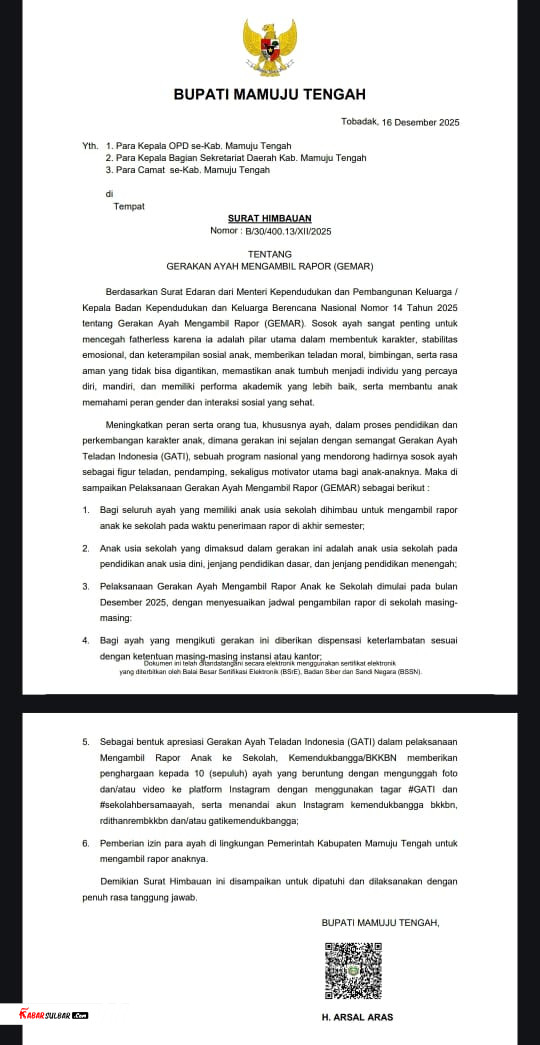 Mamuju Tengah — Gerakan Ayah Mengambil Rapor (GEMAR) merupakan kebijakan yang lahir dari niat baik negara untuk memperkuat peran ayah dalam pengasuhan dan pendidikan anak. Kebijakan ini merujuk pada Surat Edaran Menteri Kependudukan dan Pembangunan Keluarga/Kepala BKKBN Nomor 14 Tahun 2025, yang dilatarbelakangi kekhawatiran terhadap fenomena fatherless yang dinilai berdampak pada karakter, stabilitas emosional, dan perkembangan sosial anak.
