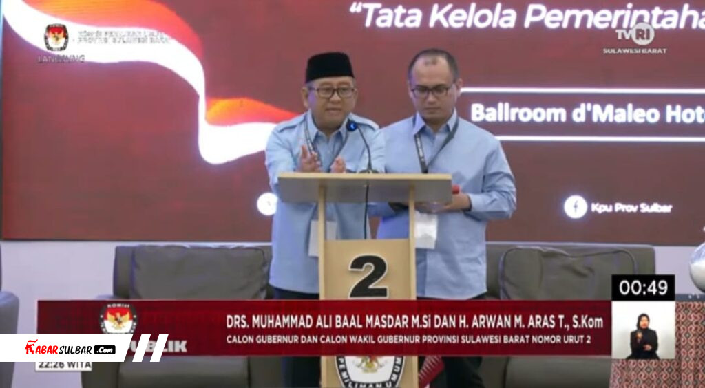 Mamuju– Pasangan calon Gubernur dan wakil Gubernur Sulbar nomor urut 02 Ali Baal Masdar dan Arwan Aras (ABM-Arwan) menegaskan komitmennya dalam hal pemberantasan Korupsi, Kolusi dan Nepotisme (KKN). Hal itu ditegaskan ABM-Arwan saat mengikuti debat publik putaran kedua pasangan calon Gubernur dan wakil Gubernur Sulbar yang diselenggarakn KPU Sulbar di Hotel Maleo Mamuju pada Rabu, 13 November 2024.