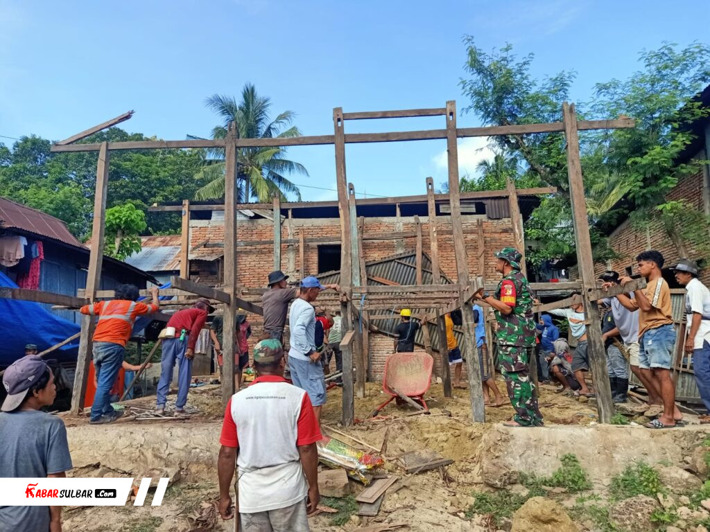 MAJENE – Semangat gotong royong terlihat saat personel Babinsa dari Koramil 1401-01/Banggae, Kodim 1401/Majene, membantu warga melakukan pembongkaran rumah di Desa Pamboborang, Kecamatan Banggae, Kabupaten Majene, Sulawesi Barat, Minggu (19/4/2026).