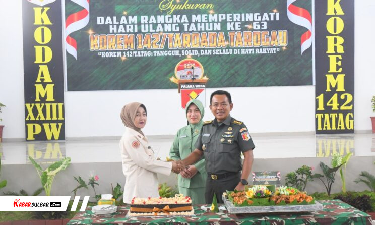 Mamuju, — Komando Resor Militer (Korem) 142/Tatag menggelar acara syukuran dalam rangka memperingati Hari Ulang Tahun (HUT) ke-63 yang berlangsung di Aula Andi Depu Makorem 142/Tatag, Mamuju, Sulawesi Barat. Peringatan tahun ini mengusung tema “Korem 142/Tatag Tangguh, Solid dan Selalu di Hati Rakyat”, yang menggambarkan semangat kebersamaan dan pengabdian Korem 142/Tatag dalam menjalankan tugas-tugas pengabdian kepada bangsa dan negara. Kamis (13/11/2025)