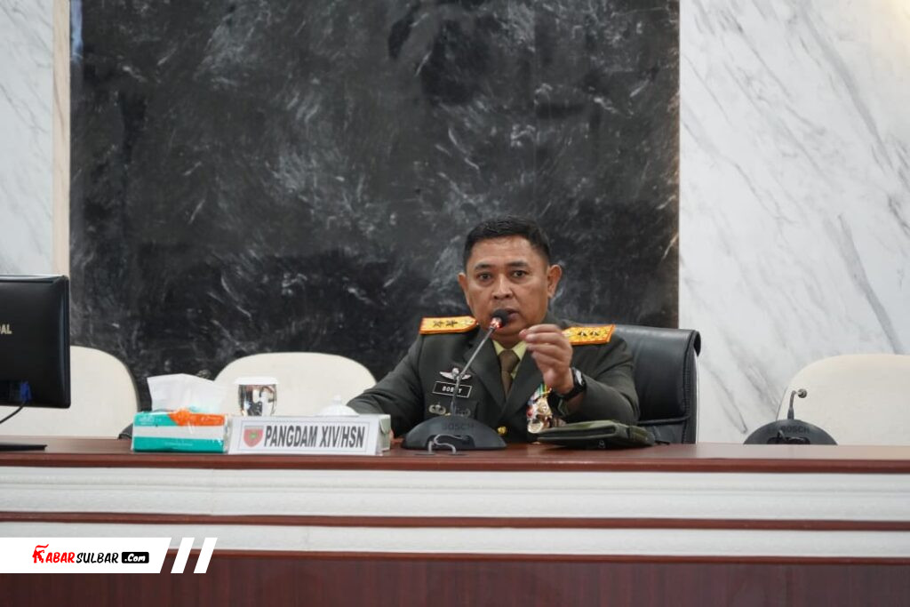 Makassar – Pangdam XIV/Hasanuddin, Mayjen TNI Bobby Rinal Makmun, S.I.P, memberikan pengarahan kepada seluruh Pejabat Utama (PJU) Kodam, Kepala Badan Pelaksana Kodam (Kabalakdam) dan para Komandan Satuan (Dansat) jajaran Kodam XIV/Hasanuddin, baik secara offline maupun virtual, terpusat di Ruang Bina Yudha Makodam Jl. Urip Sumoharjo Kota Makassar, Minggu, (10/11/2024)