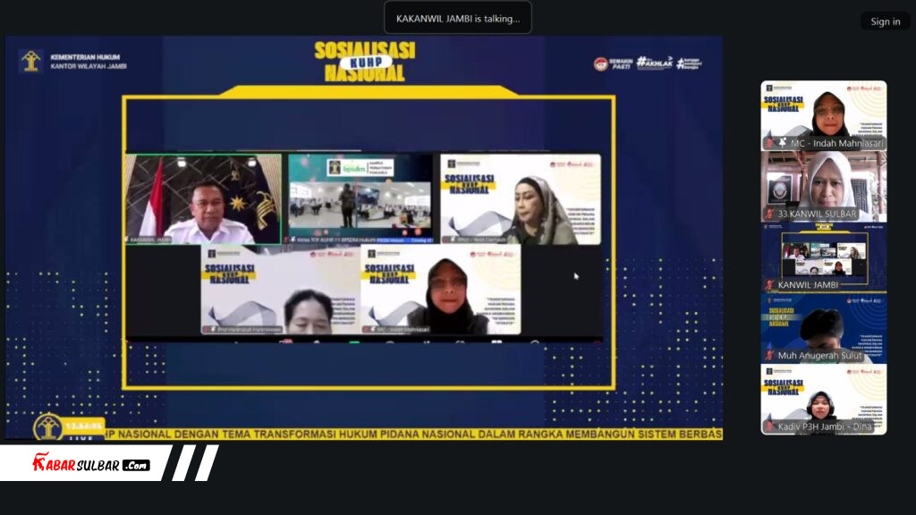 Kepala Kantor Wilayah Kementerian Hukum Jambi, Jonson Siagian, dalam laporannya menyebutkan bahwa sosialisasi virtual ini merupakan langkah strategis untuk memperkuat pemahaman para pemangku kepentingan terhadap substansi dan implikasi pembaruan Hukum Pidana Nasional yang membawa perubahan signifikan terhadap paradigma penegakan hukum yang hidup dalam masyarakat.