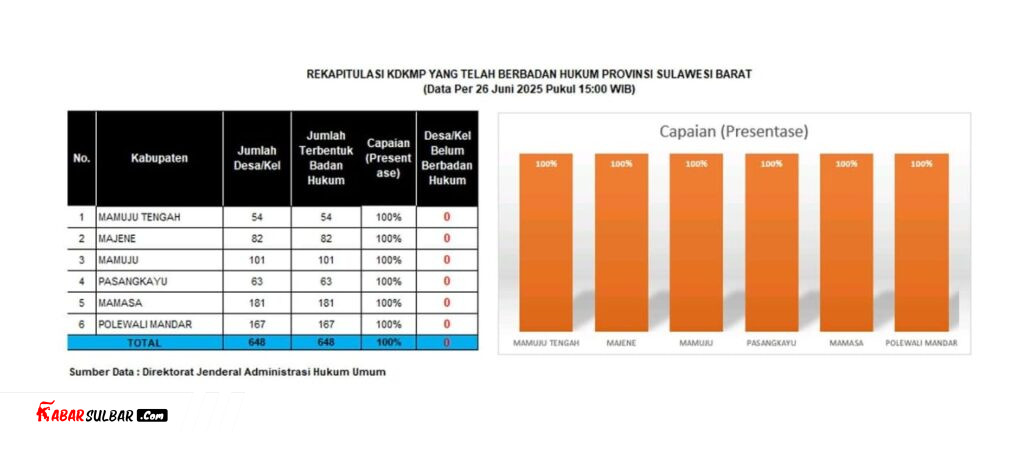 “Alhamdulillah, pada hari ini, Kamis, 26 Juni 2025, 648 desa/kelurahan (100%) di Provinsi Sulawesi Barat telah berhasil membentuk Koperasi Desa/Kelurahan Merah Putih dan disahkan pendirian badan hukumnya,” ujar Sunu Tedy Maranto.