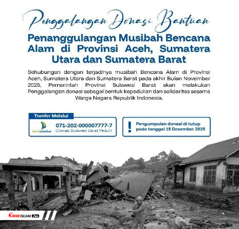 Mamuju – Pemerintah Provinsi Sulawesi Barat resmi mengumumkan penggalangan donasi untuk membantu penanggulangan musibah bencana alam yang melanda sejumlah wilayah di Provinsi Aceh, Sumatera Utara, dan Sumatera Barat pada akhir November 2025, , 4 Desember 2025.