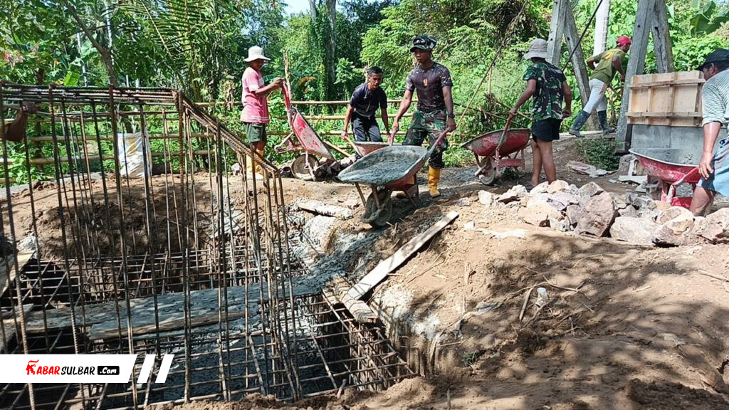 Di lokasi pembangunan, personel TNI bersama warga tampak bekerja tanpa henti menyelesaikan tahapan pengecoran sebagai bagian dari struktur utama penopang jembatan.