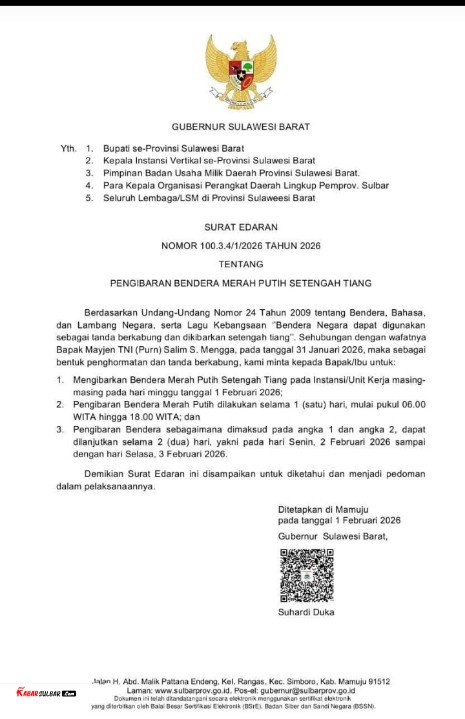 Beranda » Berita » PENGUMUMAN RESMI: Pemprov Sulawesi Barat Instruksikan Pengibaran Bendera Setengah Tiang Sebagai Tanda Berkabung