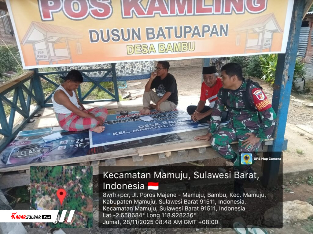 Mamuju – Dalam rangka menjaga stabilitas keamanan dan ketertiban masyarakat (Kamtibmas) di wilayah binaan, Babinsa Koramil 1418-01/Mamuju untuk Desa Bambu, Praka Marhaban, melaksanakan kegiatan Komunikasi Sosial (Komsos) yang dilanjutkan dengan pengecekan Pos Ronda di Dusun Baru Papan Desa Bambu, Kecamatan Mamuju, Kabupaten Mamuju, Jumat, 28/11/25.