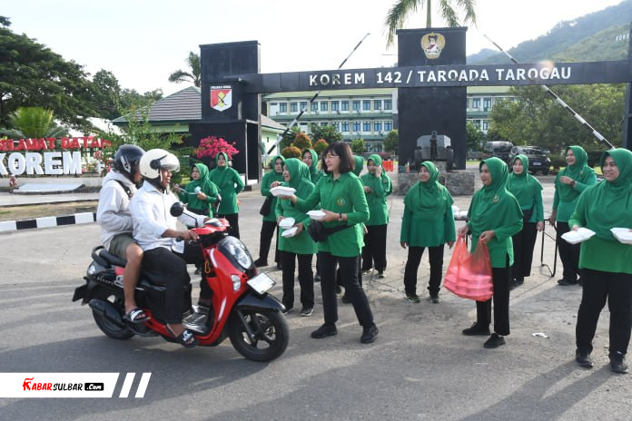 Mamuju – Dalam semangat berbagi dan kepedulian sosial di bulan suci Ramadhan 1447 Hijriah tahun 2026, Persit Kartika Chandra Kirana (KCK) Koorcab Rem 142 PD XXIII/Palaka Wira menggelar kegiatan berbagi takjil gratis kepada Masyarakat bertempat di depan Makorem 142/Tatag, Kabupaten Mamuju, Provinsi Sulawesi Barat. Kamis, 5 Maret 2026