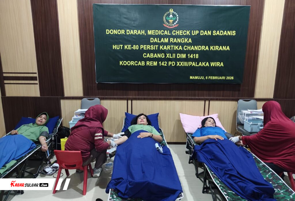 Mamuju – Dalam rangka menyambut Hari Ulang Tahun (HUT) ke-80 Persit Kartika Chandra Kirana Tahun 2026, Persit KCK Koorcab Rem 142/Tatag menggelar kegiatan donor darah bertempat di Aula Makodim 1418/Mamuju, Kabupaten Mamuju, Provinsi Sulawesi Barat, Jumat (6/1/2026).