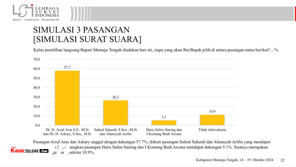Mamuju Tengah- Arsal Aras-Askary Anwar tetap kokoh di fase survei bulan Oktober 2024. Survei yang dilaksanakan oleh Lembagai Survei Indonesia (LSI) pada tanggal 14 sampai 19 Oktober tersebut menemukan trend elektabilitas paslon nomor urut satu ini kian sulit terkejar.