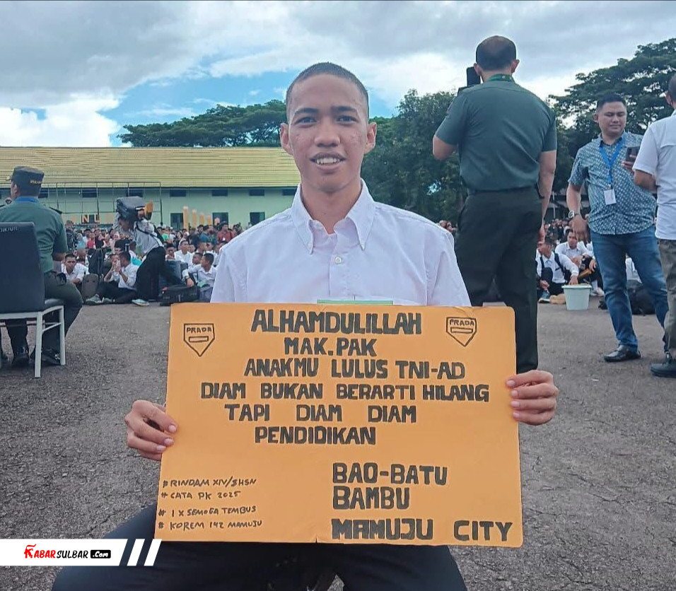 Mamuju, – Suasana penuh haru dan kebanggaan terpancar dari raut wajah seorang pemuda yang tengah duduk sambil memegang sebuah papan bertuliskan pesan penuh makna. Dalam foto yang beredar, seorang pemuda asal Mamuju dengan senyum bahagia mengabarkan bahwa dirinya telah lulus sebagai anggota TNI Angkatan Darat (TNI AD).