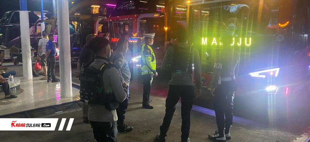 Mamuju — Tim Satgas Operasi Zebra Marano 2025 Polresta Mamuju bersama petugas Terminal Tipe A Simbuang Mamuju melaksanakan kegiatan uji kelayakan armada bus Antar Kota Antar Provinsi (AKAP) di Terminal Simbuang sebelum keberangkatan menuju Kota Makassar. Jumat malam, 21 Nopember 2025