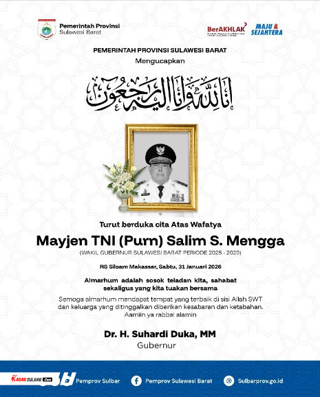 Kepergian Mayor Jenderal TNI (Purn) Salim Mengga menjadi duka mendalam bagi Pemerintah Provinsi Sulawesi Barat dan seluruh masyarakat. Almarhum dikenal sebagai sosok pemimpin yang berdedikasi, berintegritas, serta memiliki komitmen kuat dalam mendukung pembangunan dan stabilitas daerah.