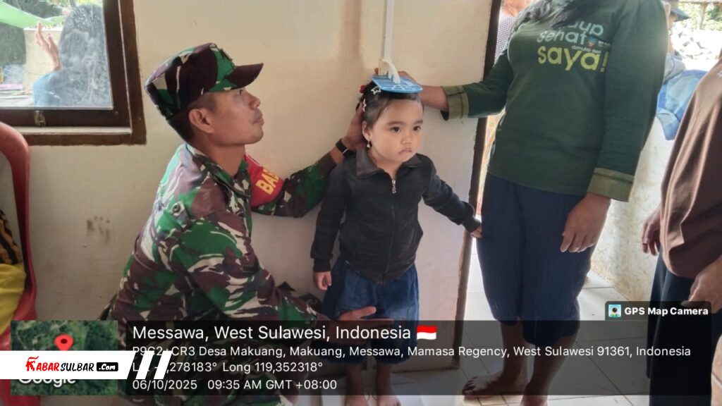 Mamasa – Babinsa Koramil 1428-02/Sumarorong Sertu Muhammad Afid Melaksanakan pemantauan Kegiatan dan mendampingi Tim kesehatan PKM Messawa penimbangan balita dalam rangka penanganan Stunting di Dusun Tondok Salu Desa Makuang Kecamatan Messawa Kabupaten Mamasa, Senin (06/10/2025)